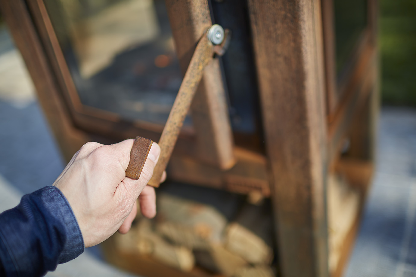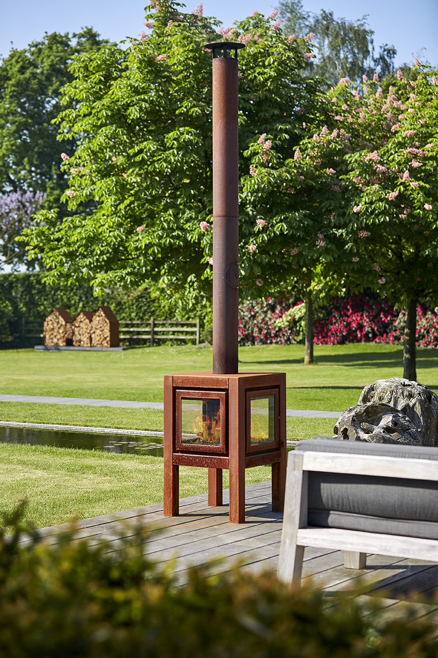 Der einzigartige modulare Aufbau ermöglicht es Ihnen, Ihren eigenen individuellen Außenkamin zusammenzustellen. Standardmäßig wird der QUARUBA L auf vier Beinen geliefert. In jedem Bein befindet sich ein Edelstahlbolzen, der nach Ihren Wünschen gedreht werden kann, um den Kamin zu nivellieren. Für mehr Flexibilität bieten wir auch ein mobiles Plateau an, das sich perfekt für Terrassen mit mehreren Plätzen eignet. Der Türverschluss ist zwischen der Türverkleidung und dem rechten Bein verborgen und die Seiten des Kamins sind mit dem SGI-System ausgestattet. Das "Saubere-Glas-System" sorgt dafür, dass ein Luftstrom direkt am Fenster entlang entsteht, was den Verbrennungsprozess fördert. Dadurch bleibt das Fenster unglaublich sauber und Sie können weiterhin die atmosphärischen Flammen genießen. Wenn Sie den Kamin in der Nähe einer brennbaren Wand platzieren möchten, empfehlen wir Ihnen die Option Hitzeschild, die in Kombination mit der Betonrückwand dafür sorgt, dass die Rückseite des Kamins nicht heiß wird. Erleben Sie mit dem QUARUBA L den perfekten Außenkamin für Ihre Terrasse.