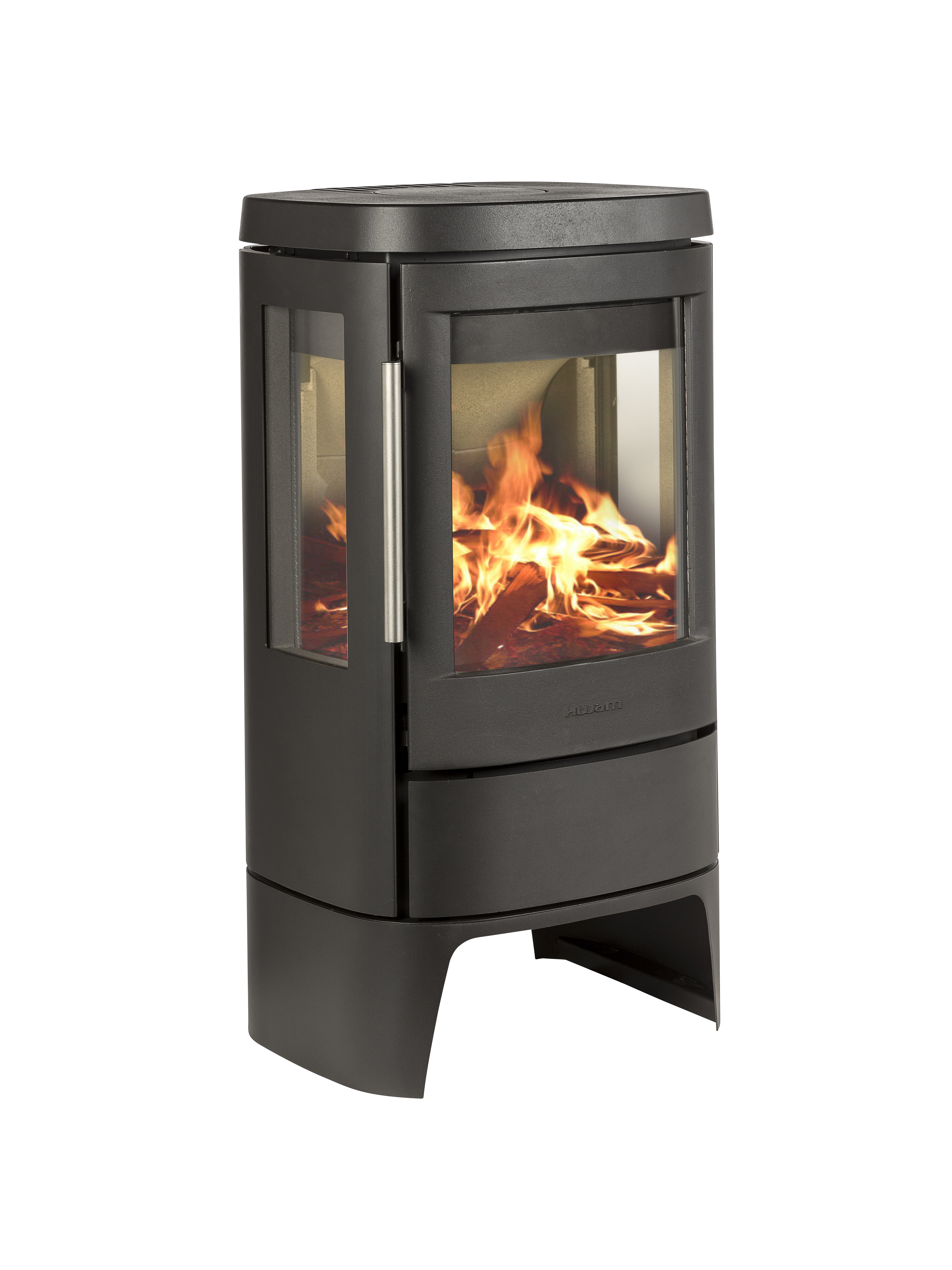 Kleiner und moderner Kaminofen mit einer großen Glastür und zwei Seitenscheiben, die einen sehr guten Blick aufs Feuer ermöglichen. Konvektionsofen mit mechanischer Verbrennungsautomatik. Wählbar in der Classic Variante (c) mit einer Gusseisenrahmentür oder in der modernen Variante (m) mit einer großen Glastür (m) für einen modernen und leichten Ausdruck. Dieses Modell ist in drei verschiedenen Sockelvarianten oder als wandhängend bestellbar.