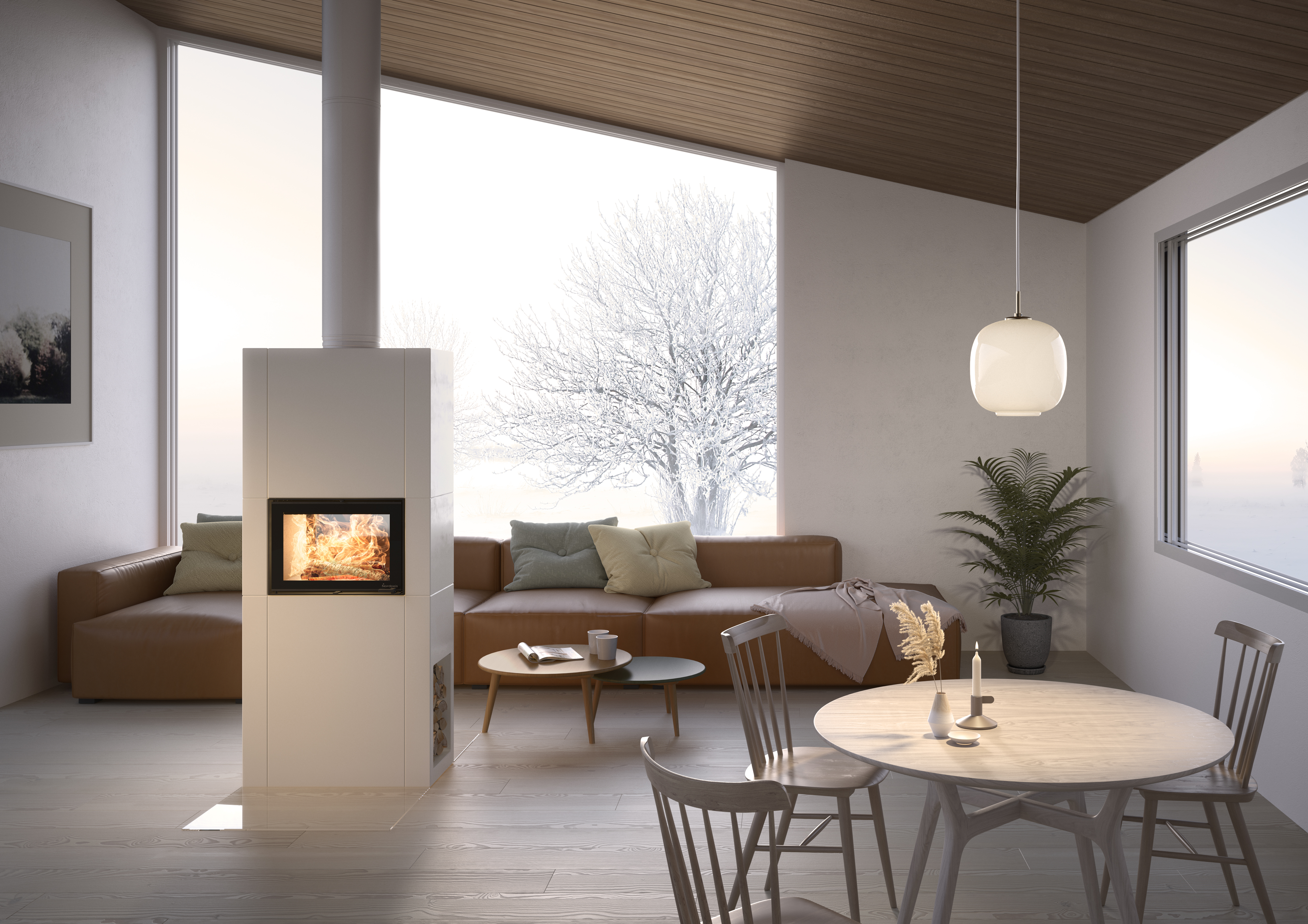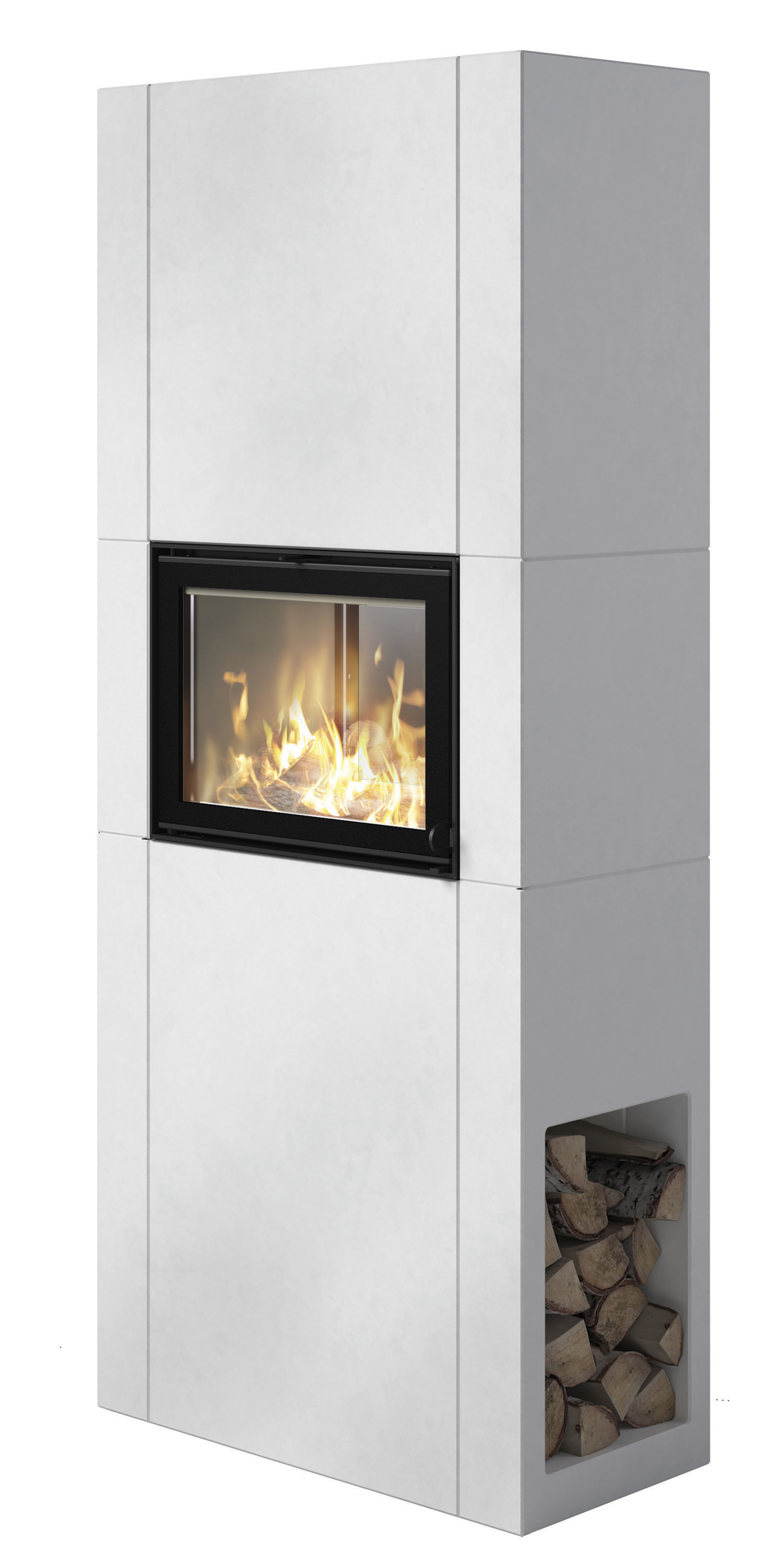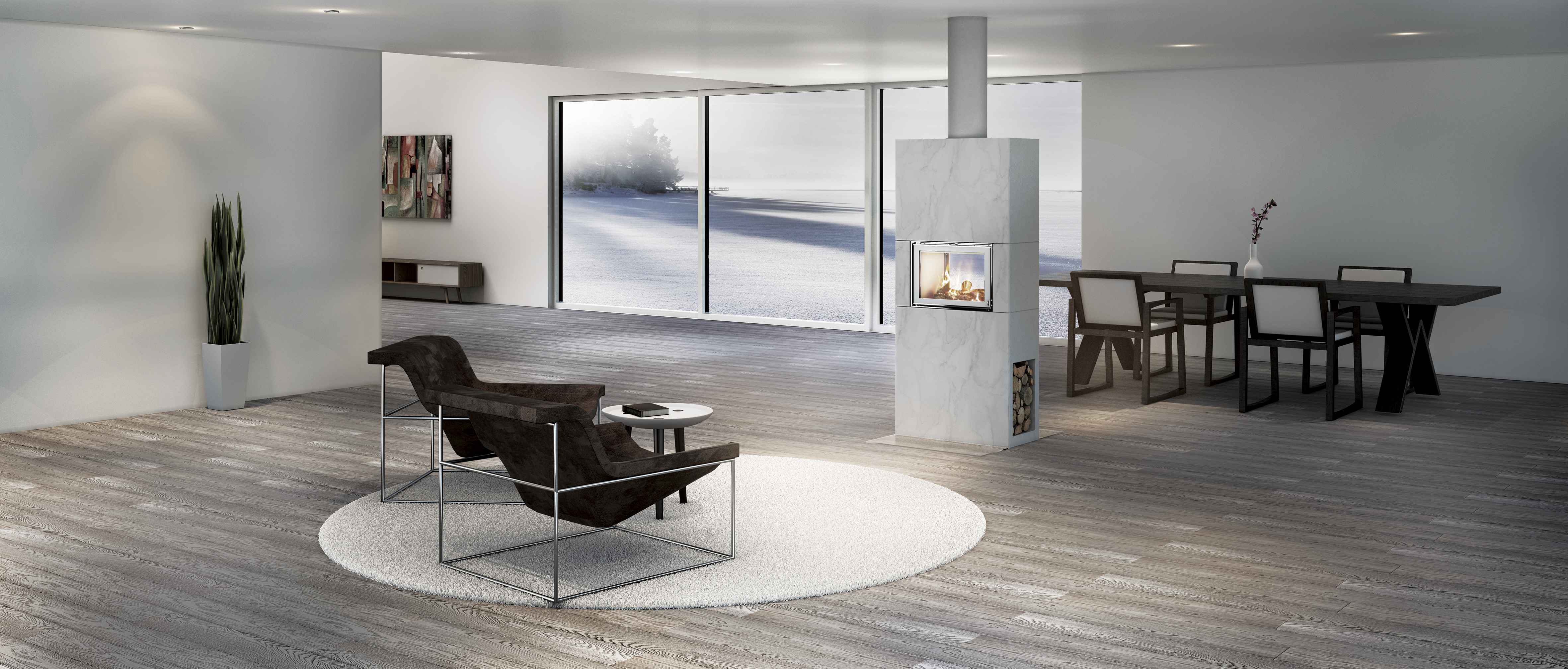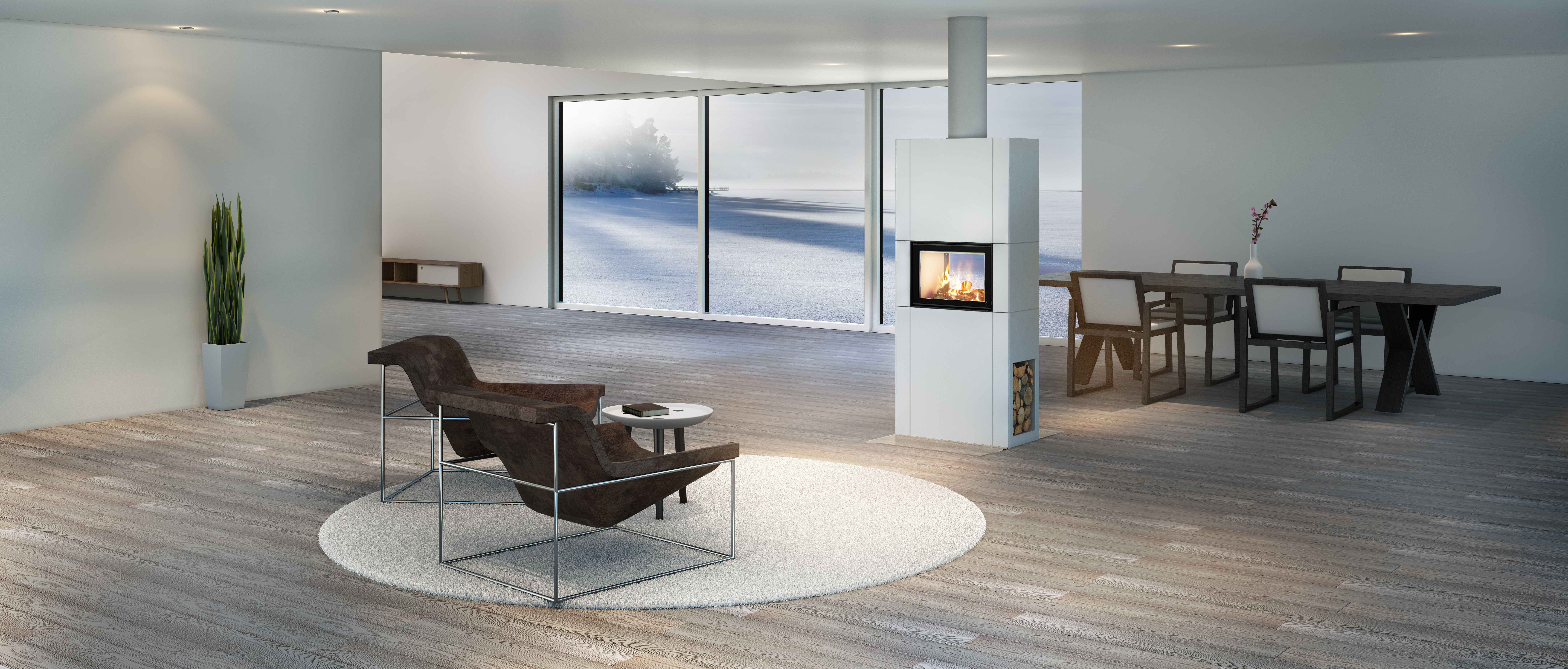 Stilreiner Tunnelkamin, der den Blick auf die Flammen von beiden Seiten gewährt. Eine praktische Holznische rundet das Bild ab. Eine saubere Verbrennung ist durch die Doppelverglasung gewährt. Bei einem Rauchrohrabgang nach oben ist ein optionaler Speicherblock möglich.