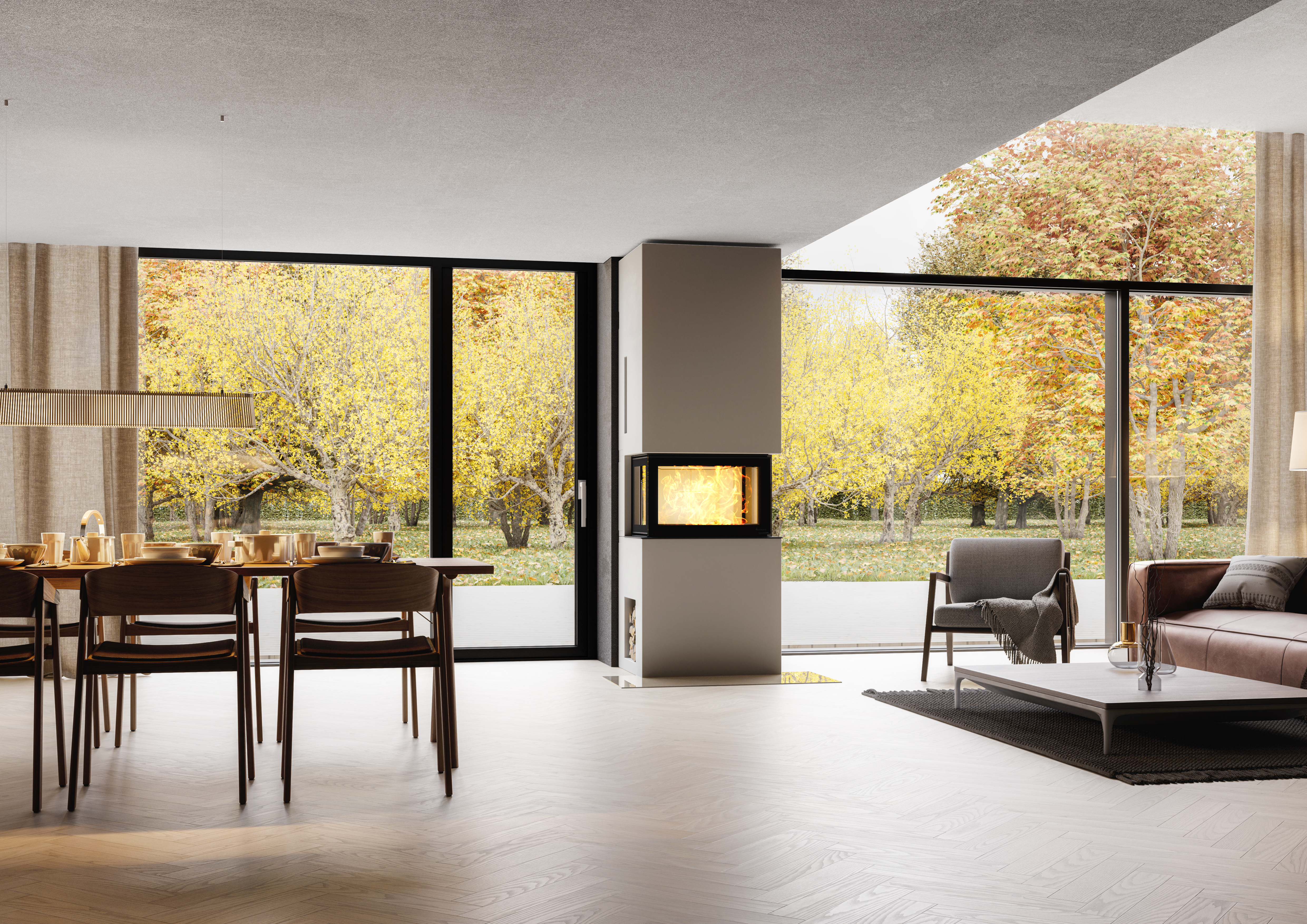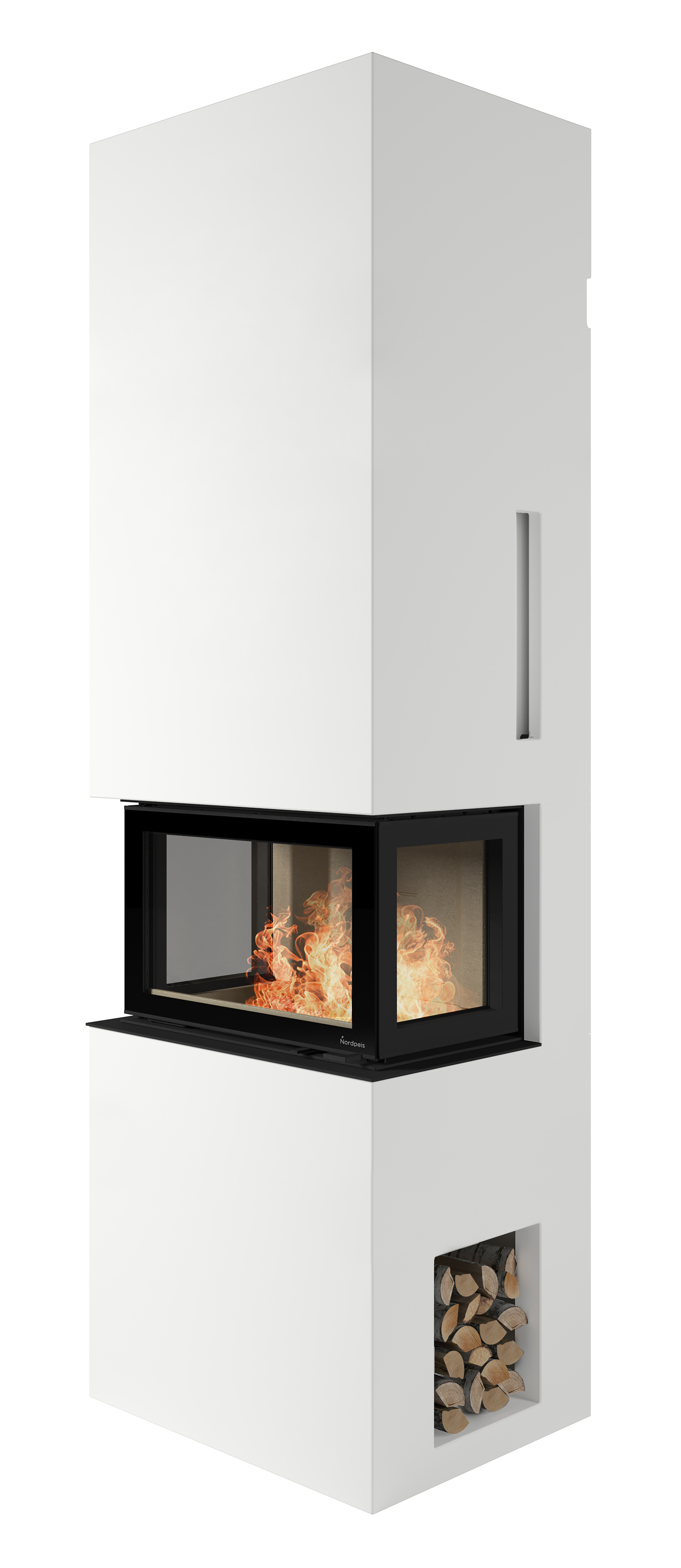 Präsente Kaminanlage für größere Räume. Raumhoch mit Panoramasicht auf das Flammenspiel. Inklusiv ist die stilvolle Holznische unter dem Heizeinsatz. Perfekt zum Lagern des Feuerholzes.